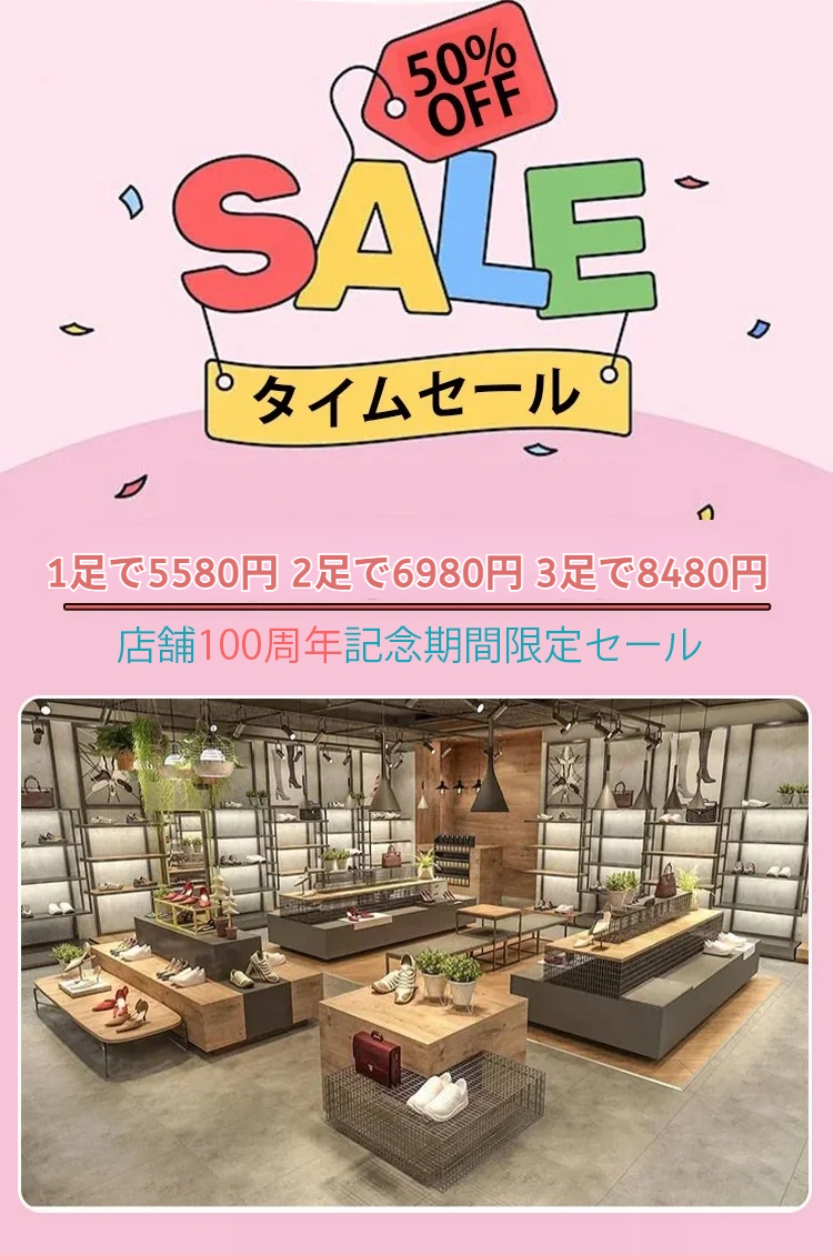 店舗100周年記念期間限定セール、本日注文で、半額割引、残り80足、10年間履いても壊れない、14日間の無料試着、満足できない場合は全額返金します