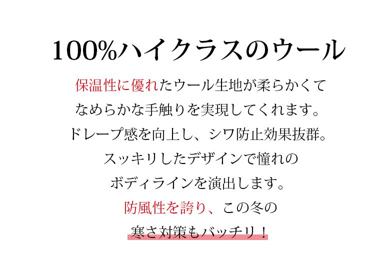 保温性に優れたウ一ル生地が柔らかくてなめらかな手触りを実現してくれます。ドレ一プ感を向上し、シフ防止効果抜群スッキリしたデザインで憧れのボディラインを演出します。