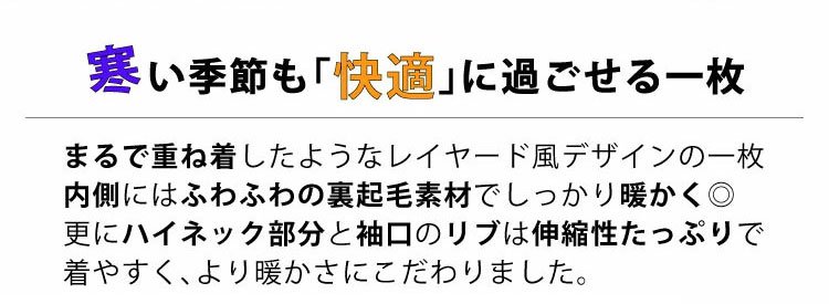 寒い季節も「快滴」に過ごせる一枚!まるで重わ着したようなレイャ一ド風デザインの一枚内側にはふわふわの裏起毛素材でしっかリ暖かく◎更にハイネック部分と袖口のリプは伸縮性たっぶリで着やすく、よリ暖かさにこだわりました。